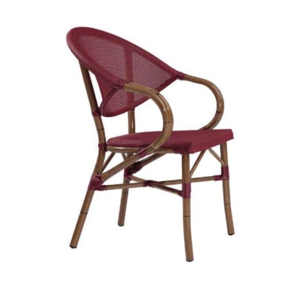 Bordo Meshli Bambu Kollu Sandalyemiz, kafenize renk katacak. Showrooma bekliyoruz.